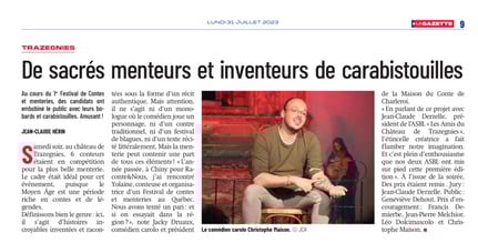 Merci à Jean-Claude Hérin pour ce bel article dans La Nouvelle Gazette de ce lundi 31 juillet, relatif à notre 1er Festival de Contes et Menteries de Trazegnies des 28 et 29 juillet 2023