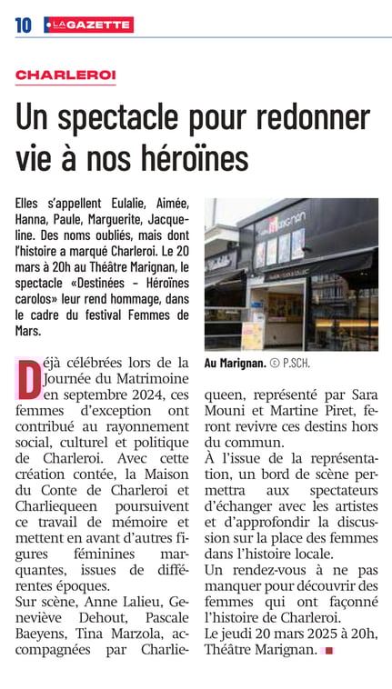 Quand Sudinfo LaNouvelleGazette Charleroi parle de notre prochain spectacle du 20 mars 2025 à 20h00 au Théâtre Marignan : "Destinées... Héroïnes Carolos".